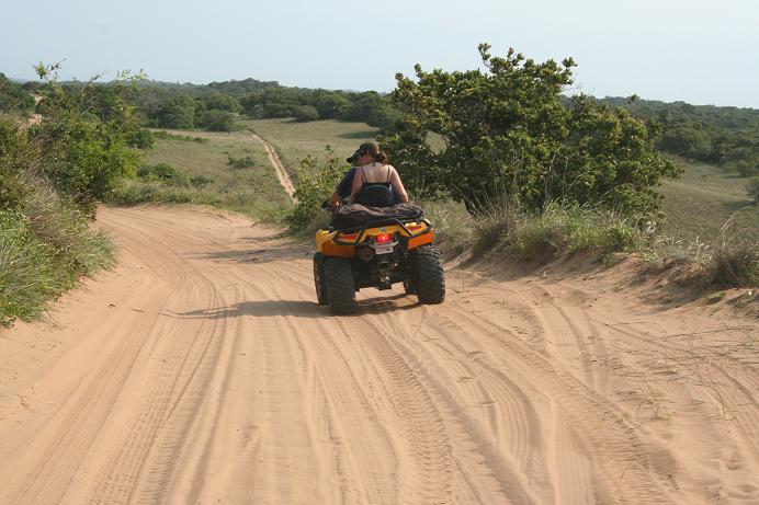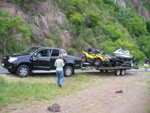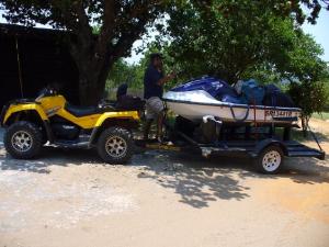 By 6 o’clock Saturday morning we had reached Pongola, and here we stopped for a well deserved Wimpy breakfast..yumm! We then set off for the last part of our journey to Cosi bay, where we were to cross the border. Once the border post was in sight, the guys drove the whole rig off the road and started undoing all the ropes and unloading our bags from the bakkie. Miss Gym Bunny(MGB) and I were quite confused about this, and after much banter we discovered that we were leaving the bakkie and the big trailer behind…we will be entering into Moz with only the 2 quadbikes, the larger one of the two will be towing the small trailer with the jetski and our bags strapped to it. Whooooop! Super exciting stuff.