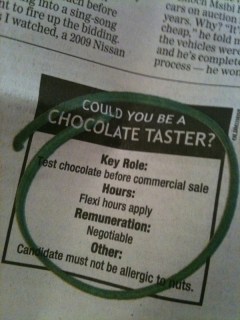 1. I can confidently say that you can have that job. I'll wait until they have a position for testing jelly beans or something. #notachocolatelover ;)(P.S: my word verification is "Nutso", freaky)